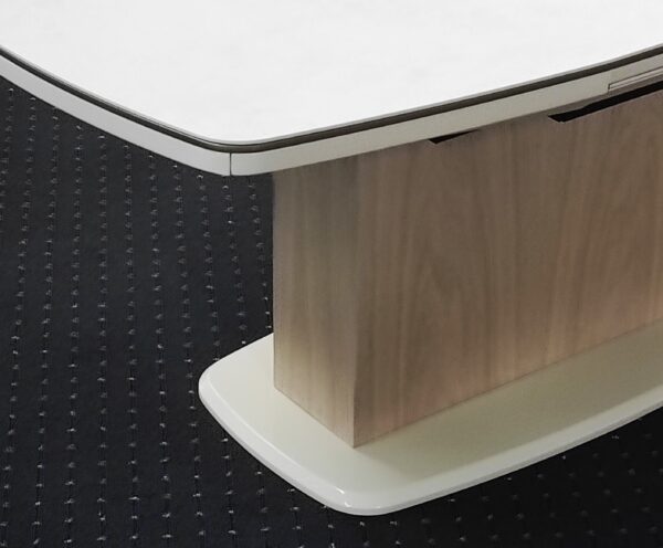 - Subtelne zaokrąglenia linii bocznych jak też narożników blatu nadają optycznej lekkości jak też pozbawiają produkt ostrych krawędzi.